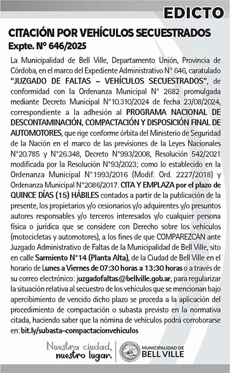 El señor Juez de 1° Inst. 1° Nom. C.C.C. y Flia. de Bell Ville (Sec. Nº 2), hace saber la Sentencia Nº UNO del 12/02/2026, en autos: "BERTELLO JORGE ERNESTO - USUCAPION" (Expte. N° 12908131). Y VISTOS: .... Y CONSIDERANDO: .... RESUELVO: I) Hacer lugar a la demanda de prescripción adquisitiva veinteñal en todas sus partes y en consecuencia declarar que el Sr. Jorge Ernesto Bertello, DNI N°11.231.600 adquirió con fecha 31/ 12/2023 el inmueble que se describe según plano de mensura confeccionado por el Sr. José A. Teghillo Ingeniero Agrimensor como: "A partir de la identificación de los límites de lo poseído, que según su orientación dimensiones y linderos así surgen: Partiendo del vértice A hasta el vértice B lado A-B= 17,49 m, y como frente al Bv. Maipú, materializado por alambrados perteneciente al poseedor, desde el vértice B hacia el vértice C lado B-C= 34,44 m, y como frente a la calle Leandro Alem, materializado en parte por alambrados y en parte por muros contiguo de 0,15 m de espesor perteneciente al poseedor; desde el vértice C hasta el vértice D lado C-D= 17,37 m, materializado por muro contiguo de 0,15 m de espesor, perteneciente al poseedor y colindando con Juan Del Bianco F° 39235 A° 1972, Parc. 10; desde el vértice D hasta el vértice A lado D-A= 34,43 m, materializado por muro contiguo de 0,15 m de espesor perteneciente al poseedor y colindando con Raúl Osvaldo Bacci F° 30817 A° 1960, Parc. 8; se procedió al relevamiento planimétrico de los mismos, calculándose los elementos geométricos del polígono límite de la posesión, según plano, vértices A-B-C-D. Vinculando este polígono con el entorno relevado, el análisis de sus colindancias, y a través de los antecedentes obtenidos en los registros de la Delegación N° 15 de la Dirección General de Catastro, se concluye que no se ha podido determinar dominio afectado, la cuenta N° 3603 1555931/2, se encuentra empadronada en la Dir. Gral. de Rentas a nombre de Alicia Gómez de Macagno" y según el certificado de subsistencia parcelaria fijado en el plano de mensura visado por la Dirección General de Catastro en el Expte. N° 0563-002542-09, se describe como: "Inmueble ubicado en el Departamento UNION, Pedanía BELL VILLE, Municipalidad de BELL VILLE designado como LOTE 40 que se describe como sigue: PARCELA de 4 lados, que partiendo del esquinero noroeste, vértice A con ángulo de 90° 07´y rumbo noreste hasta el vértice B mide 17,49 m (lado AB) colindando con Bv. Maipú; desde el vértice B con ángulo de 89° 40´ hasta el vértice C mide 34,44 m (lado B-C) colindando con calle Leandro Alem; desde el vértice C con ángulo de 90° 17´ hasta el vértice D mide 17,37 m (lado C-D) colindando con Parc. 10 de Mauricio Cesar Saretti (M.F.R 1105071 - CTA. 36030206602/3); desde el vértice D con ángulo de 89° 56´ hasta el vértice inicial mide 34,43 m (lado D-A) colindando con Parc. 8 de Marcos Cesar Olmos (M.F.R. 929005 - cta. 3603 0206934/ 1), cerrando la figura una superficie de 600,18 m2". Que la presente usucapión afecta en forma parcial el inmueble inscripto con relación al dominio N° 548 f° 431 del año 1909 a nombre de José Martínez (inmueble inventariado al N° 48). II) Publicar por edictos la presente sentencia por diez (10) veces con intervalos regulares en un período de treinta (30) días en el diario Boletín Oficial y en un diario local (art. 783 ter y 790 CPCC). III) Ordenar al Registro General de la Provincia la protocolización del plano de mensura de posesión confeccionado por el Ing. Agrimensor Sr. José A. Teghillo y visado por la Dirección Prov. de Catastro en Expte. N° 0563-002542-09 con fecha 27/11/ 2009. IV) Oficiar al Registro General de la Provincia a los fines de la inscripción y registración del inmueble objeto de autos a nombre del usucapiente…. Protocolícese, hágase saber y dése copia. Firmado: Dr. SANCHEZ Sergio Enrique, Juez. Por diez (10) veces (a intervalos regulares dentro de un período de 30 días).Boletín Oficial. (Vence: 26/03/2026)