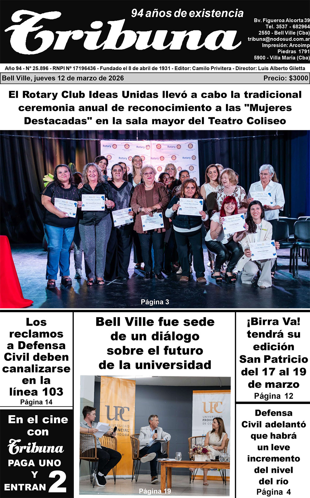 El domingo y en el marco de la celebración del Día Internacional de la Mujer, el Rotary Club Ideas Unidas de nuestra ciudad llevó a cabo la tradicional ceremonia anual de reconocimiento a las "Mujeres Destacadas" en la sala mayor del Teatro Coliseo, que se vió colmada por la presencia de las agasajadas, familiares y público en general. Además, se trató de la entrega número diez de este reconocimiento, marcando un hito del club rotario local en la promoción de estas distinciones destinadas a "visibilizar a mujeres de nuestra comunidad cuya labor cotidiana -muchas veces silenciosacontribuye a construir una ciudad basada en la ética, el compromiso y la coherencia". Como dato sin precedentes, en esta gala también se destacó a dos hombres, como un signo de "igualdad", por sus aportes en materia de solidaridad y superación personal.