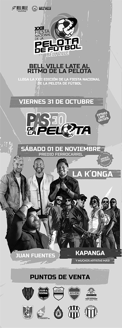 Cada vez falta menos para la Fiesta Nacional de la Pelota de Fútbol 2025, los días viernes 31 de octubre y sábado 1 de noviembre. Finalizó la instancia de selección por parte de los jurados, de los artistas que participarán en el escenario central, el sábado en el escenario mayor en el predio del Ferrocarril. En la categoría música representarán a la ciudad Camila Pino, La Guttem Band y Rey Mamut, mientras que desde Córdoba capital se sumarán Kepianco y Juan Bonetto. En tanto, en el género danza, los grupos elegidos fueron Gitana Mora y Baila-Arte. La Dirección de Cultura y Educación del municipio les agradece a todos los artistas que participaron del certamen.